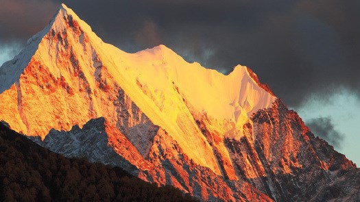 洛绒牛场:“日松贡布”三座神山环绕,贡嘎河从草场穿梭,林间溪流潺潺,与牧场木屋交相辉映,构成了一幅原始而又迷人的景色,令人们进入返朴归真的境界。这里观“日松贡布”三座神山尽收眼底。